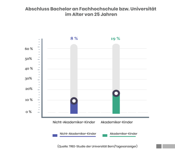 Aber so einfach ist der soziale Aufstieg durch Bildung nicht. Zwar ist die Möglichkeit des Bildungsaufstieges in der Schweiz gegeben, aber die Schweizer Bildungsmobilität ist gering. Denn bis heute spielt die Herkunft eine grosse Rolle bei den Bildungschancen. Akademikerkinder hätten in der Schweiz doppelt so grosse Chancen, einen Uni-Abschluss zu erhalten, als Kinder von Nicht-Akademiker-Eltern, wie der Tagesanzeiger anhand von Daten der sogenannten TREE-Studie der Universität Bern herausgefunden haben will.
