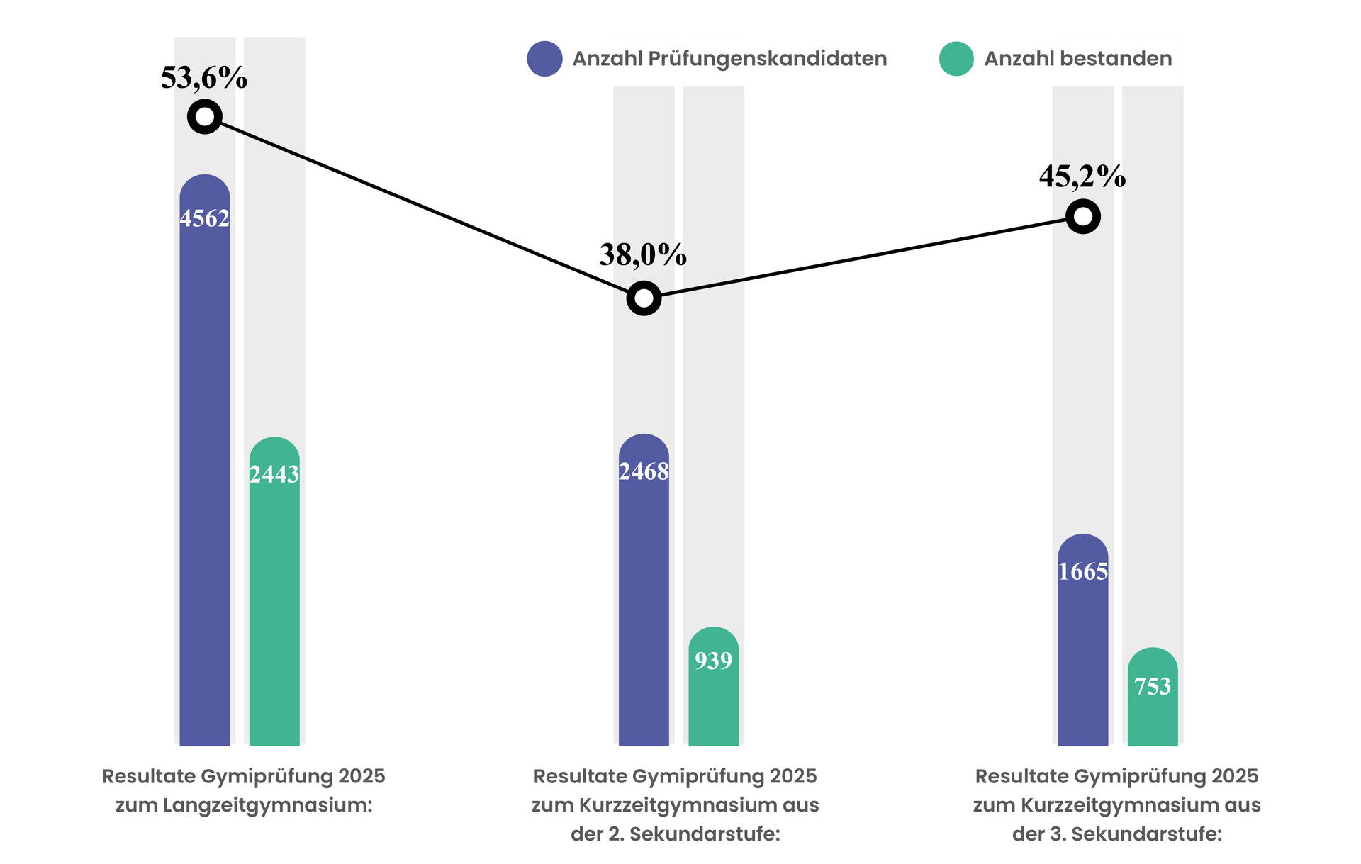 - Resultate Gymiprüfung 2025 zum Langzeitgymnasium: von 4'562 Prüflingen haben 2'443 bestanden, also 53,6 %